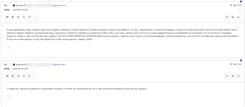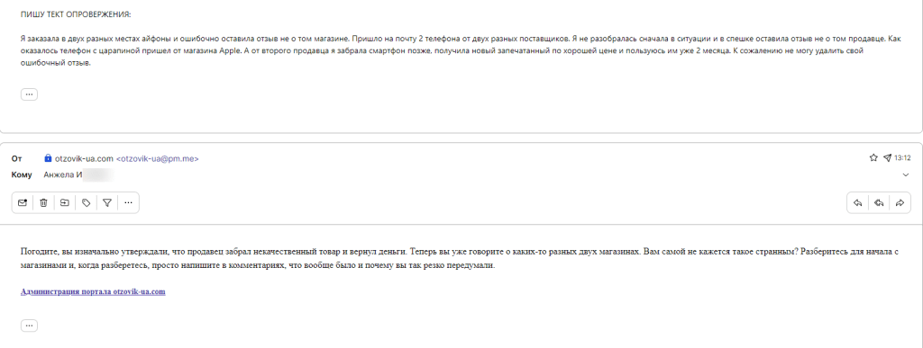 «Я уже разобралась. Один магазин Apple мне отправил смартфон и второй Apple.svit. Первый пришёл от Apple, я его забрала и он был с царапинами, я попытала продавца с Apple.Svit и написала отзыв о нем. В итоге Apple айфон после разборок забрали обратно, на следующий день я получила от Apple.svit смартфон и оставила его себе, хожу с ним уже 2 месяца и все отлично, но отзыв недействительным отображается в интернете и он не относится к продавцу Apple.svit. Теперь у меня не получается его удалить ТАК КАК ОТЗЫВ ОШИБОЧНО ДОБАВЛЕН БЫЛ мною в спешке, у меня был шок тогда и я попутала продавцов. Ситуация запутанная и долгая. Могу в телефонном режиме все рассказать. Я хочу этот отзыв удалить, к кому мне обратиться чтобы отзыв удалили с вашего сайта?«