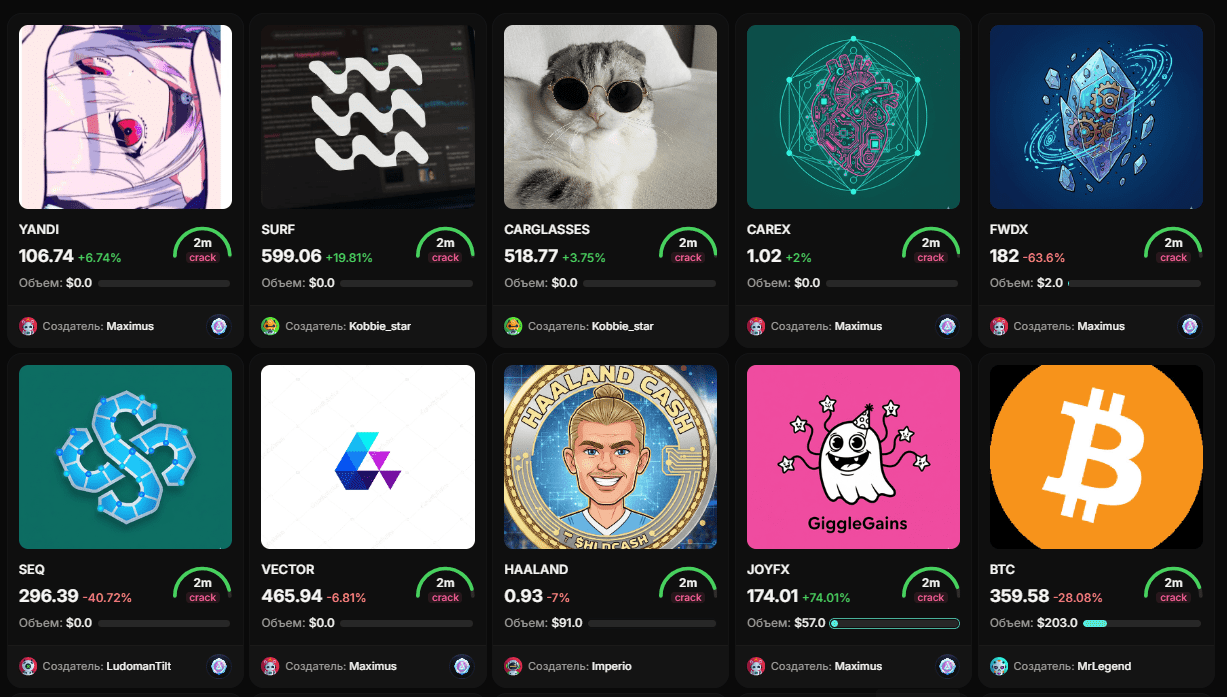 Сама платформа напоминает биржу мемкоинов, но на самом деле похожа она лишь оболочкой. Catapult Trade зверь необычный, совмещает гемблинг с трейдингом. Графики создаются по математическому алгоритму и живут ограниченное время, а у пользователей есть возможность их создавать и, как утверждает платформа, зарабатывать на них с комиссий трейдеров.